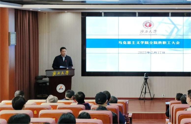 2月17日下午15:00时,英国365公司2023年春季学期教职工大会于学院101报告厅召开。会上,徐秦法院长介绍了新入职及回院工作的教师,对2022年学院工作进行了全面总结。2022年,我院在学科建设方面取得优异成绩,马克思主义理论学科在第五轮学科评估中取得较好成绩,成为英国上市公司365最好的两个学科之一; 教学科研取得丰硕成果,《马克思主义理论与实践》、《毛泽东思想和中国特色社会主义理论体系概论》两门课程获批自治区一流课程,教师在各类教研教学竞赛奖中获奖12项,思政课建设成效得到自治区教育厅思政课教学巡察组的赞许和肯定;教师获批国家社科基金重大招标项目1项、西部项目1项,教育部人文社科青年项目1项,广西哲学社会科学规划项目3项。师生发表高水平理论文章47篇;人才培养效果显著,11人获国家级奖励,48人次获区校级奖励,2个班级获校先进班集体,毕业生初次就业率达86.7%,在全校文科学院名列前茅;学院建设进一步升优化,社会服务效果良好。最后,徐院长对全体教职工在过年一年的辛勤付出表达了感谢,并对2023年重点工作进行了安排和部署。