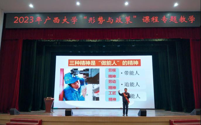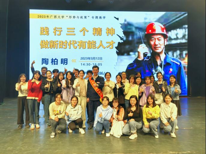 2023年3月11日,在我校大礼堂举行的“形势与政策”课程专题教学报告会上,柳州工匠学院-柳钢集团工匠学校执行校长、全国五一劳动奖章获得者、百名全国劳动模范服务团,百名广西产业工人党的二十大精神宣导团,柳州市劳模工匠宣讲团成员陶柏明先生为到场师生做了题为“践行三个精神,做新时代有能人才”的报告。