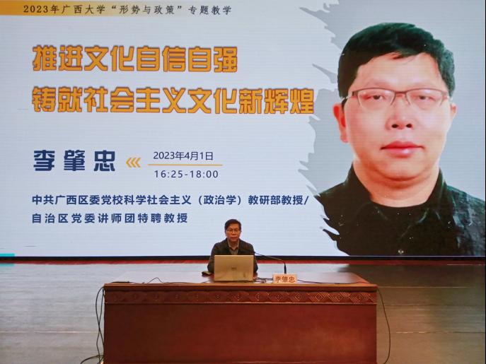 2023年4月1日下午,我校大礼堂举行的“形势与政策”课程专题教学报告会上,中共广西区委党校科学社会主义(政治学)教研部教授,自治区党委讲师团特聘教授李肇忠同志为到场师生做了题为“推进文化自信自强,铸就社会主义文化新辉煌”的报告。