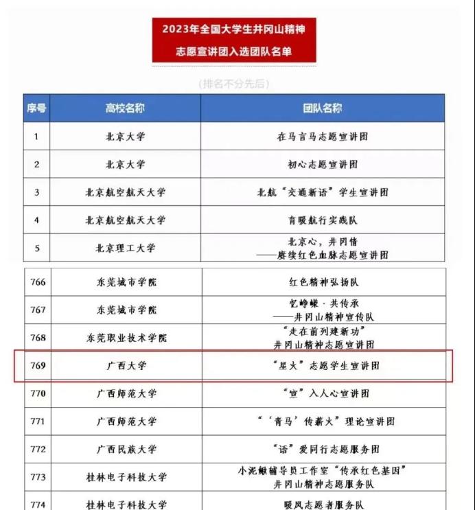 日前,团中央青年志愿者行动指导中心、全国青少年井冈山革命传统教育基地、井冈山管理局联合发布了《关于遴选2023年全国大学生井冈山精神志愿宣讲团的公告》。经过主办方的遴选,我院“星火”志愿学生宣讲团成功入选2023年全国大学生井冈山精神志愿宣讲团。
