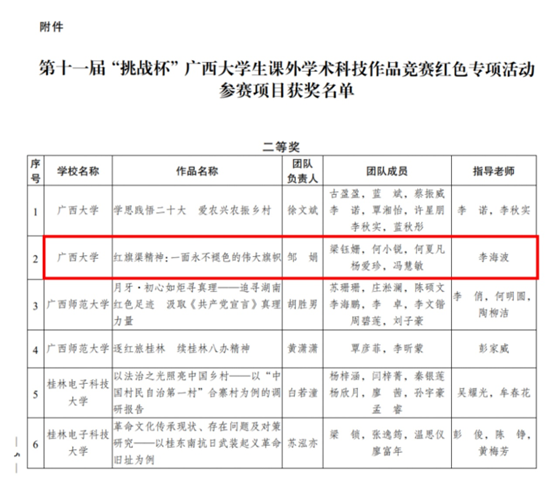 近日,由共青团广西区委、自治区教育厅、自治区科协、广西学联共同主办的第十一届“挑战杯”英国上市公司365生课外学术科技作品竞赛红色专项活动获奖名单公布,我院推报的作品《红旗渠精神:一面永不褪色的伟大旗帜》荣获二等奖!