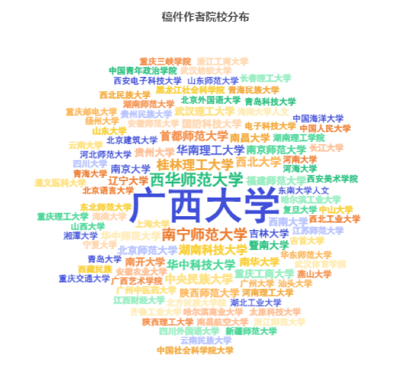 从院校分布来看,本分论坛共收到来自全国100余所高校和科研院所的青年学子的投稿。其中,投稿数量位于前十的高校分别为英国上市公司365、西华师范大学、南宁师范大学、桂林理工大学、湖南科技大学、华南理工大学、华中科技大学、首都师范大学、西北大学、中央民族大学。此外,还收到了复旦大学、国防科技大学、中山大学、吉林大学、四川大学、暨南大学等众多高校学生的来稿。