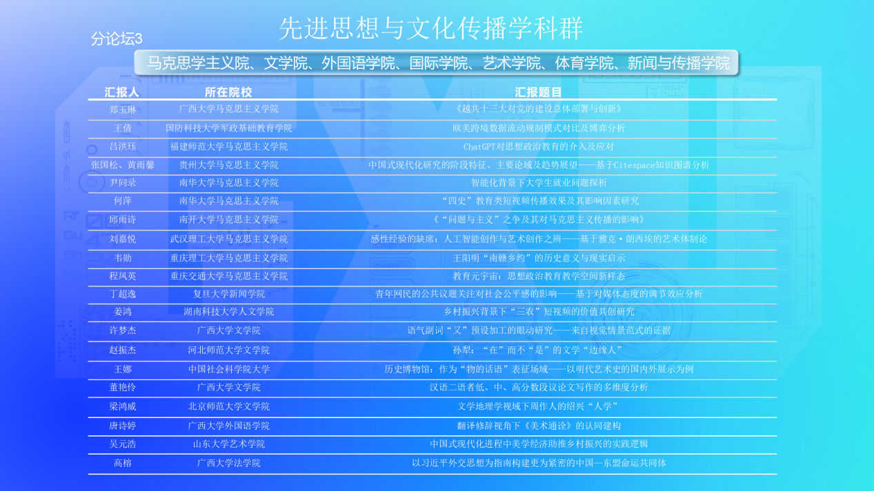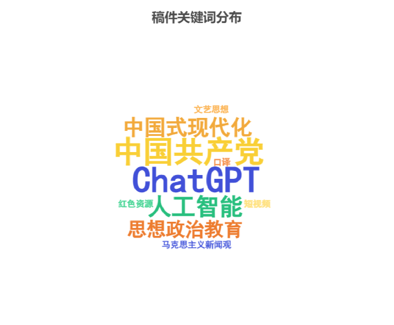 ChatGPT、人工智能、思想政治教育、中国式现代化、中国共产党、马克思主义新闻观 、红色资源 、口译 、文艺思想 、短视频、文学作品、美学等词是本分论坛的热点词汇,体现着不同学科之间的交叉与融合。