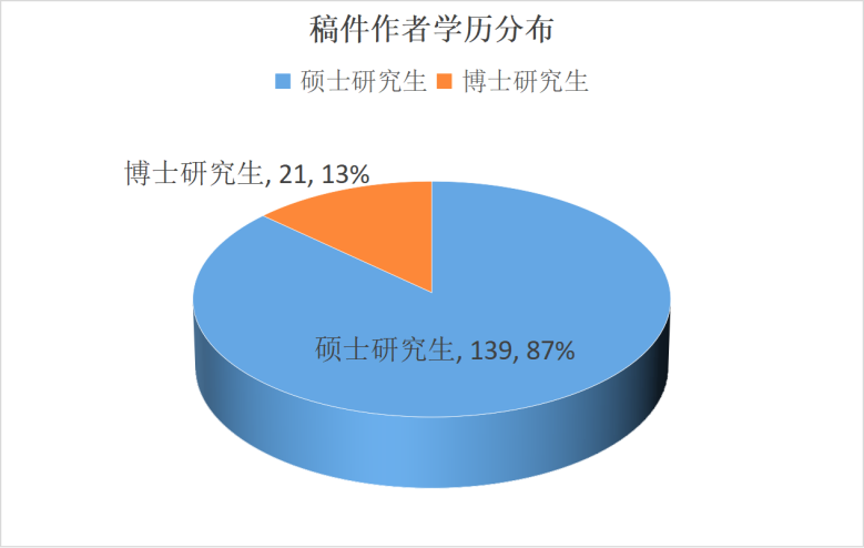 从学历层次分布来看,分论坛三投稿作者中,博士研究生21人,占投稿总人数13%;硕士研究生139人,占投稿总人数87%。