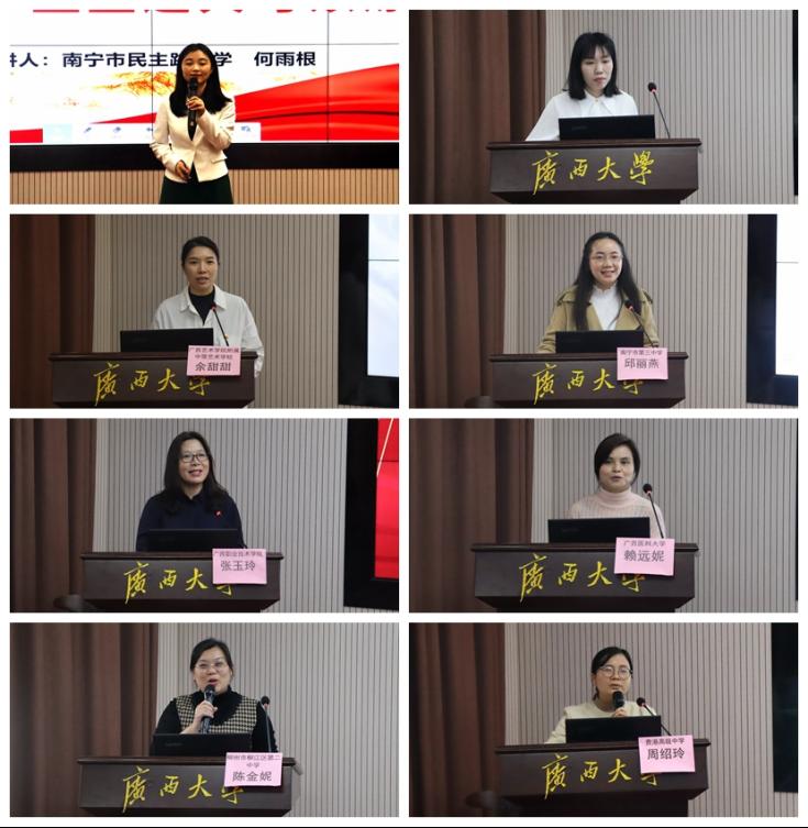 20日下午,来自南宁市民主路小学的何雨根老师、英国上市公司365附属中学的祁春兰老师、广西艺术学院附属中等艺术学校的余甜甜老师、南宁市第三中学的邱丽燕老师、广西职业技术学院的张玉玲老师、广西医科大学的赖远妮老师、柳州市柳江区第二中学的陈金妮老师、贵港市高级中学的周绍玲老师分别代表小学、初中、中职、高中、高职、本科不同学段,以及语文、历史不同学科,以“同题异构:爱国主义”为主题进行了精彩纷呈的教学展示。教学展示后,李学勇教授对每位教师的教学情况给予了充分肯定,并逐一进行了精辟中肯的点评,提出了选取主题要精准、协同思维要加强、课程定位要准确、问题导向要明确等四点建议。