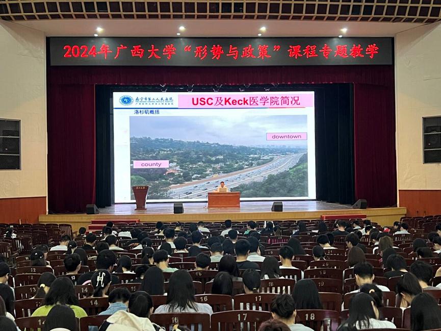 丁教授的报告从“赴美学习:在医学院的进修经历”“学成归来:开眼界后创新教学模式”“奋发有为:响应号召投身于健康广西建设”“初见成效:学科建设实现经济和社会双效益”“未来规划:以三年为期设立考核目标”“几点建议:学会感恩、忧患意识、重视团队、爱党爱国”等六个方面展开。在报告中,丁教授以图文并茂地方式深情讲述了自己在美求学求知、回国后奋发进取的经历,引导同学们深刻感受到不同文化背景下医学教学模式的差异以及学术领域话语权的重要性,进一步思考在以中国式现代化全面推进中华民族伟大复兴征程中青年的使命与担当。他表示,新时代大学生要树立远大理想,贯彻终身学习的理念,勤学苦读、增长知识与见识;要常怀忧患意识和感恩之心,时刻铭记自己为什么而奋斗的初心,乐于在奋斗中创造幸福、敢于在磨难中坚持前行、善于从党史中汲取养料,为谱写全面建设社会主义现代化国家的广西篇章贡献青春力量。