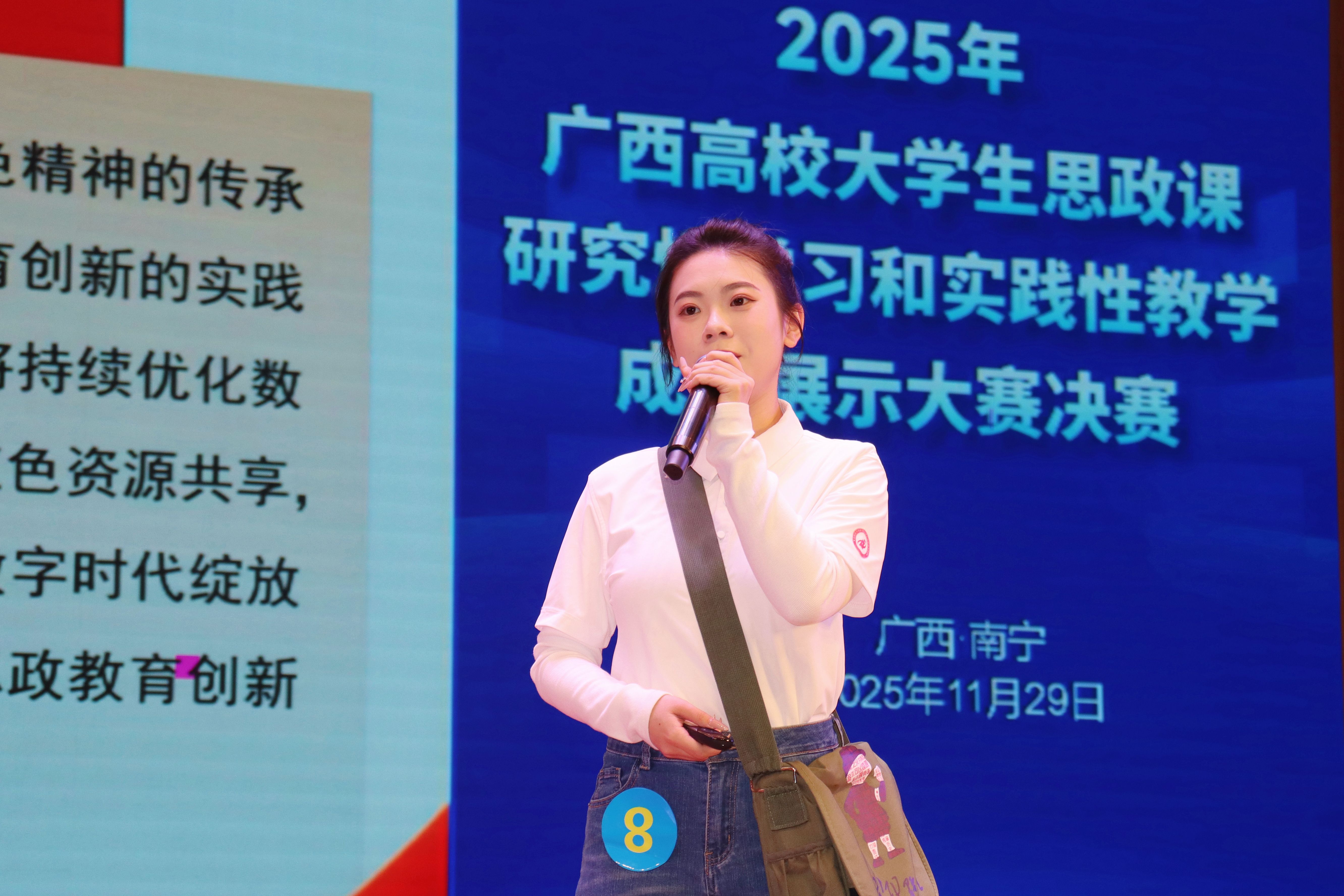 近日,2025年广西高校大学生思政课研究性学习和实践性教学成果展示大赛决赛在广西机电职业技术学院圆满落幕。经过激烈角逐,我院选派的两支参赛团队凭借扎实的研究功底、创新的实践路径和精彩的现场展示,从32项入围作品中脱颖而出,分别斩获本科组一等奖和二等奖。
