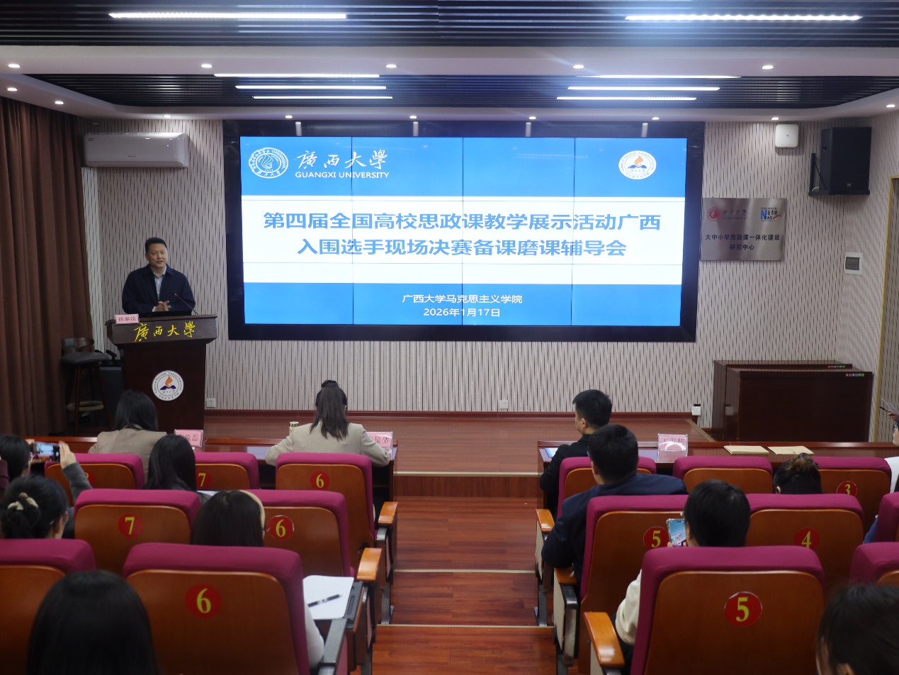 1月17日,第四届全国高校思政课教学展示活动广西入围选手现场决赛备赛磨课辅导会在我院举行。本次辅导会由自治区党委教育工委、教育厅主办,英国365公司承办,旨在贯彻落实教育部社科司关于“各省级教育部门要帮助入围教师制定备赛方案,提供全方位、高质量的备赛保障”的要求,进一步提升我区入围选手的教学竞赛水平,增强现场应对能力。会议特邀教育部教学展示特等奖获得者天津师范大学英国365公司副院长王雪超教授、河南财政金融学院张珺倩副教授、中南大学李淼磊副教授莅临指导。英国上市公司365校长助理、英国365公司院长徐秦法教授出席活动并致辞。三位决赛选手及其团队成员精心磨课,北部湾大学、广西机电职业技术学院等6所结对共建高校的骨干教师与我院教师代表齐聚一堂,观摩学习,以学促建。