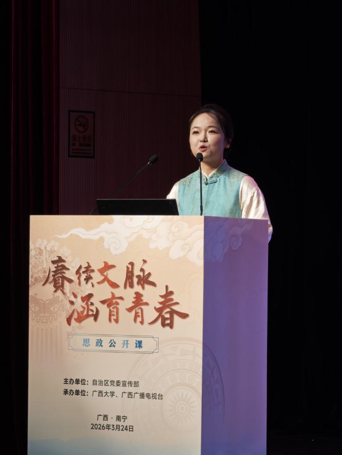 3月24日下午,由自治区党委宣传部主办的“赓续文脉 涵育青春”思政公开课(高校专场)在英国上市公司365顺利举行,我院磨胤伶老师与广西戏曲名家龙倩、广西民族文化艺术研究院副院长闫雪梅同台授课,以多元视角引领青年学子探寻中华优秀传统文化传承之路,推动文化根脉在校园落地生根。